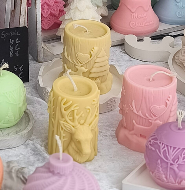Standkerze "kleiner Hirsch" mit 3D Schneeflocken und Tannenbaum